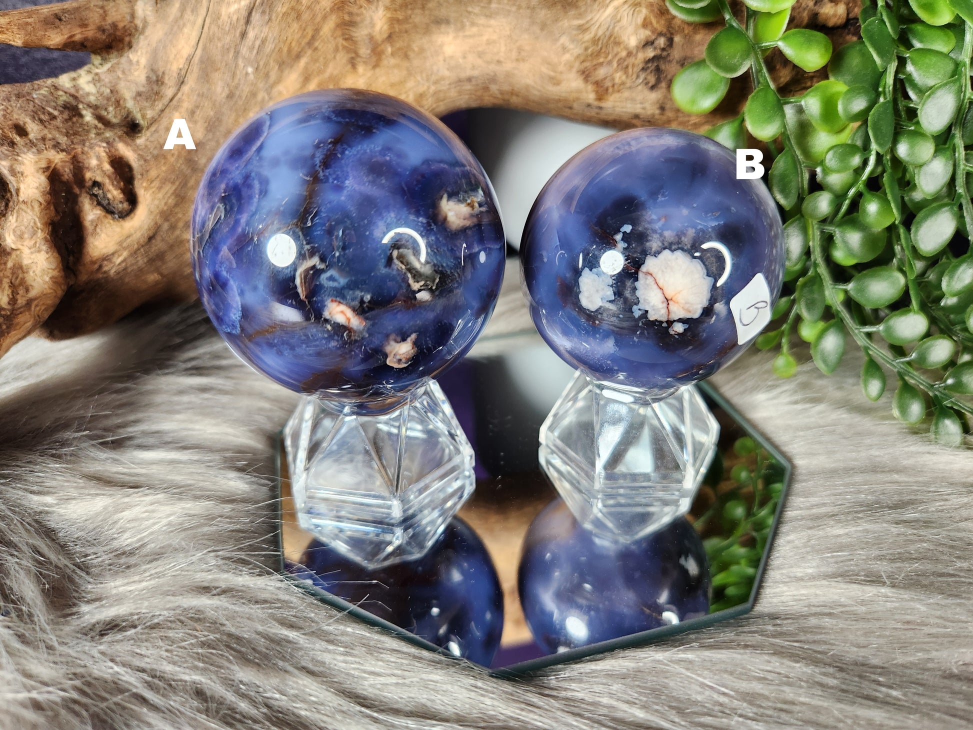 These Swirly Moody Blue Flower Agate Spheres are soft, stunning, and full of soul. Each piece showcases flowing natural banding and internal plumes, wrapped in soothing shades of moody blue, foggy gray, and soft lilac. Their perfectly polished surface makes them irresistible to hold and display.