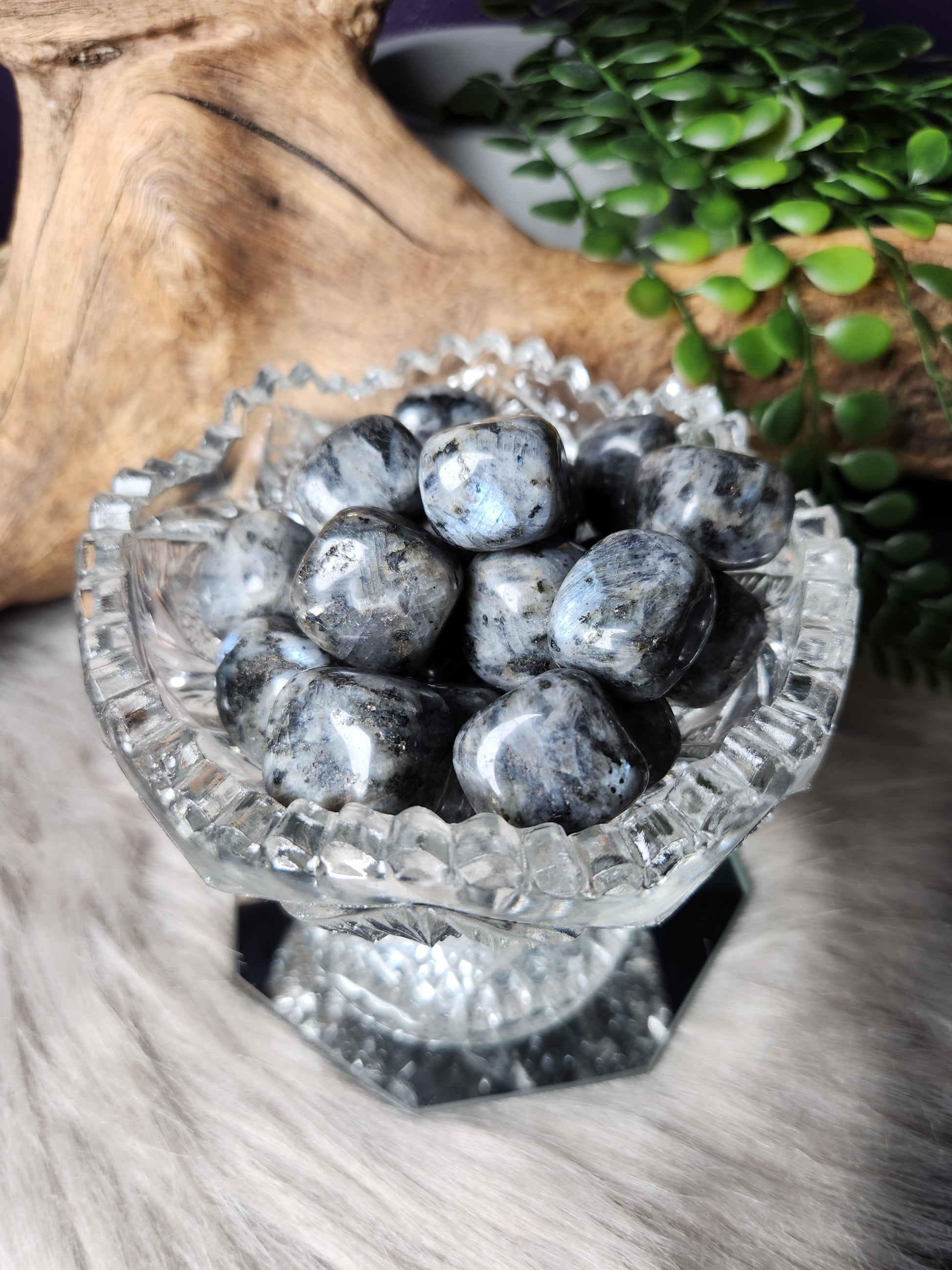 These dark, shimmery Larvikite tumbles (aka “Black Moonstone”) are full of silvery flashes that catch the light—and your third eye. Known for their deeply grounding and protective energy, Larvikite helps clear your mind while sharpening your intuition.