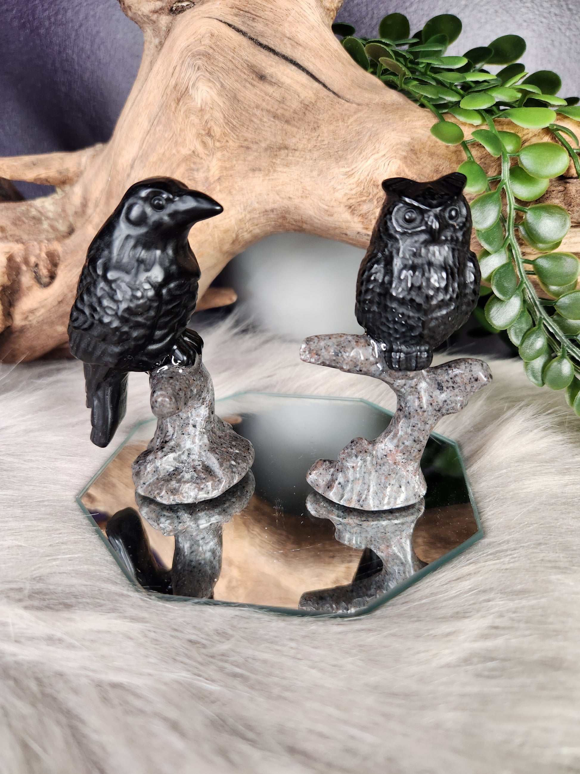 🌑 Black Obsidian Owl & Crow on Syenite Tree Branch 🖤🪶🌲