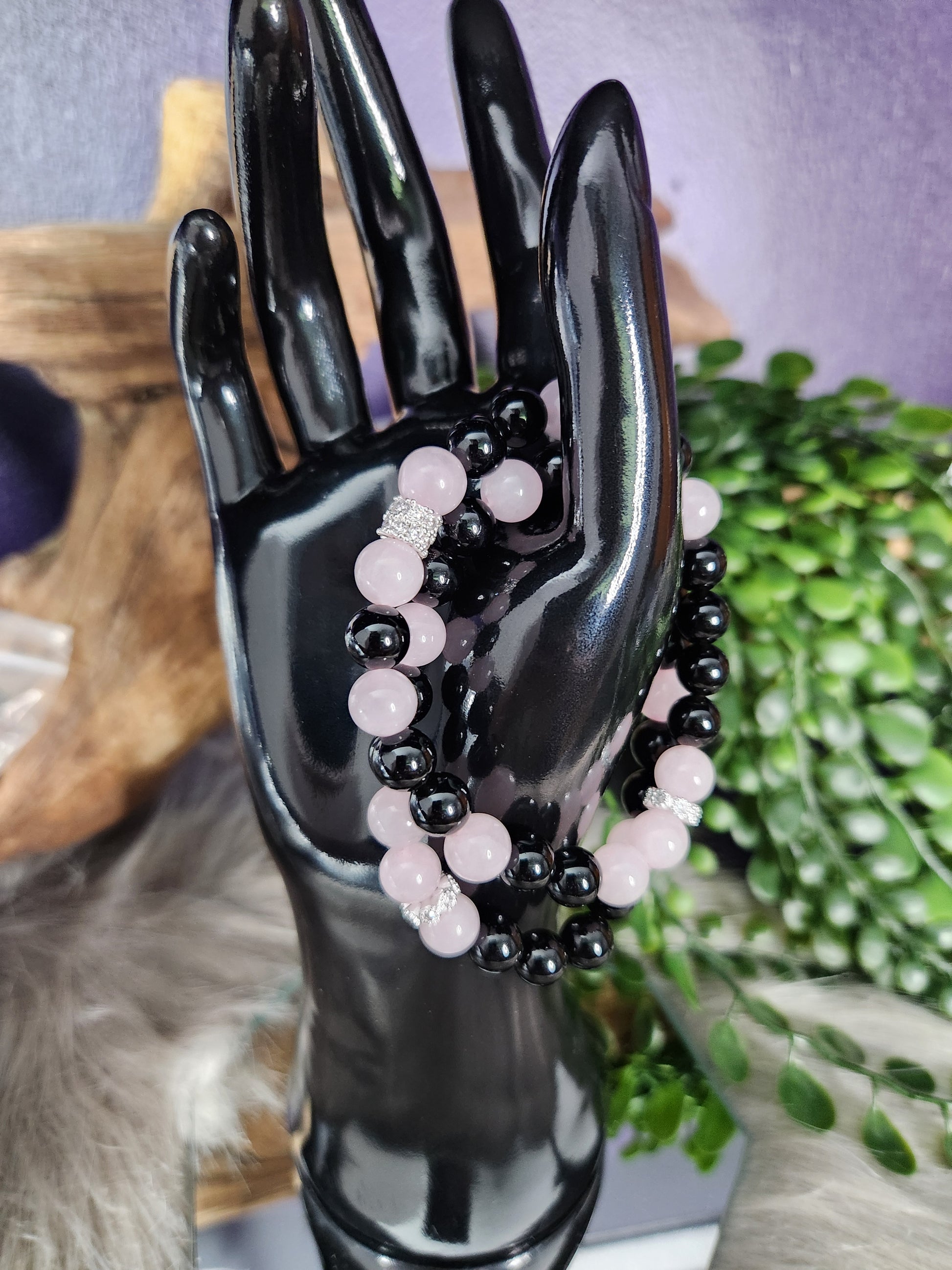 Made with natural Rose Quartz and Obsidian beads