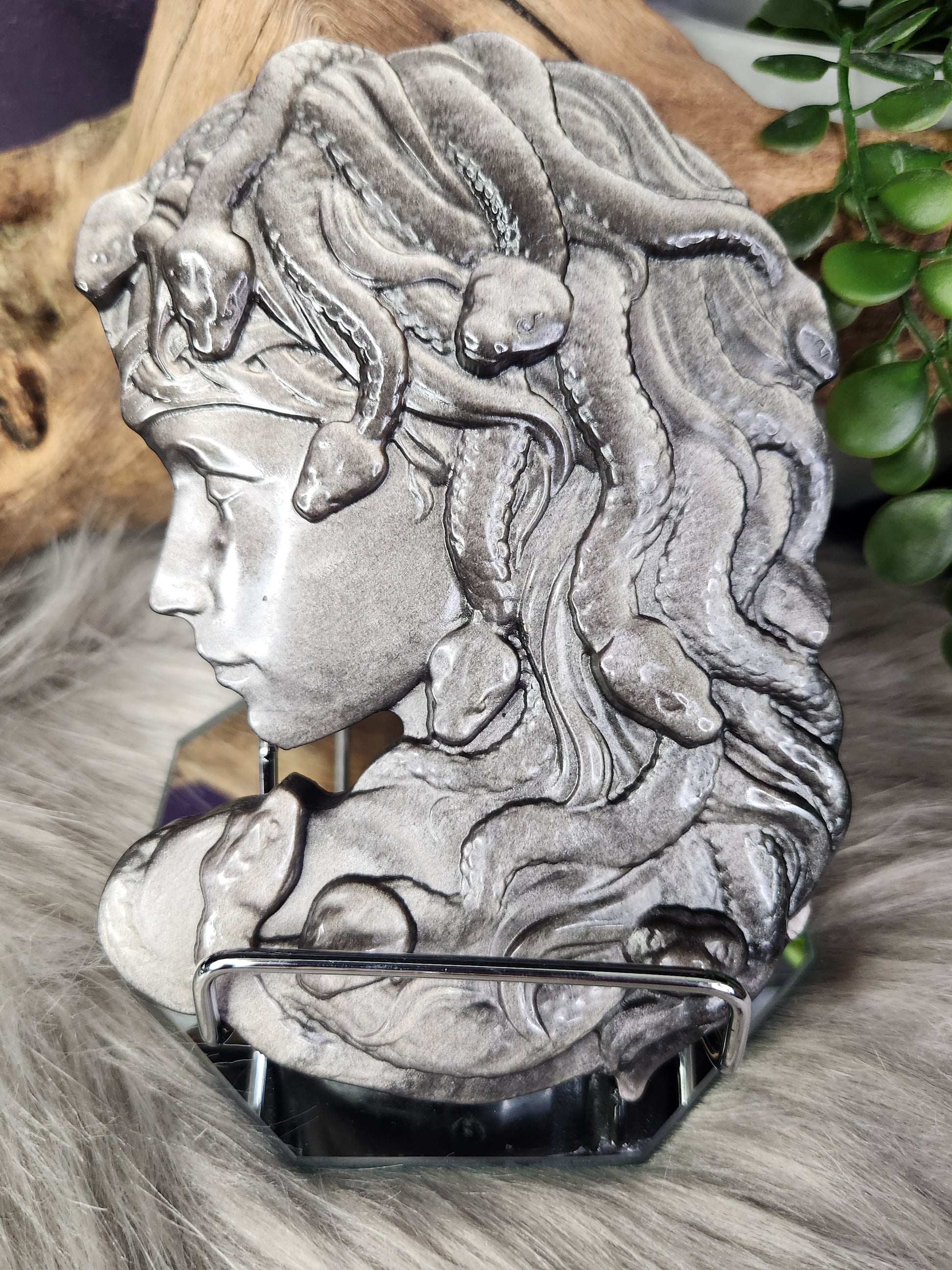 Silver Sheen Obsidian is a deeply grounding stone, known for revealing hidden truths, cutting through illusion, and offering psychic protection. Its reflective surface mirrors the inner self—making it a perfect match for Medusa’s transformative energy. This piece is not just a carving—it's a guardian, a statement, and a spell.